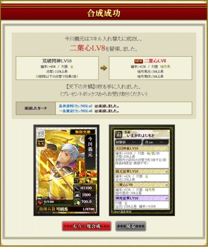 現在の状況(期待値:約5,148万) 計画(期待値:約6,710万) そのうち出るだろうとは思っていた。 本多正純の初期スキル:権勢謳歌LV10 確率:+27% / 対象 槍/弓/馬攻撃:74%上昇(合流攻撃時は発動率2倍) ⇒ S2:鼓服撃壌 このS2「鼓腹撃壌」の裏が「天…
